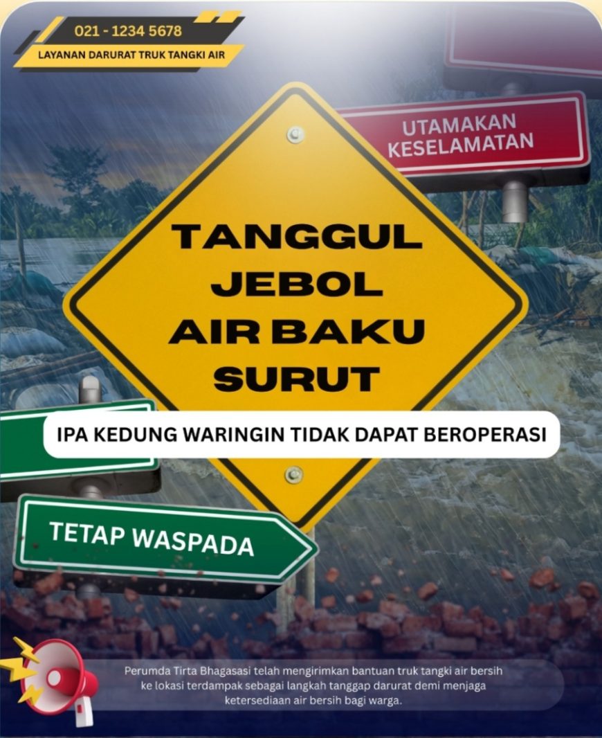 Manajemen Kantor Cabang Pembantu Kedungwaringin Perumda Tirta Bhagasasi ikut terdampak akibat tanggul Sungai Citarum jebol. Air baku yang mengalir ke instalasi pengolahan air menjadi surut sehingga IPA tidak dapat beroperasi memproduksi air bersih untuk sementara waktu. Sebagai tanggung jawab pelayanan, Perumda Tirta Bhagasasi mendistribusikan air bersih kepada pelanggan yang terdampak, dengan menggunakan truk-truk tangki. “Kami […]