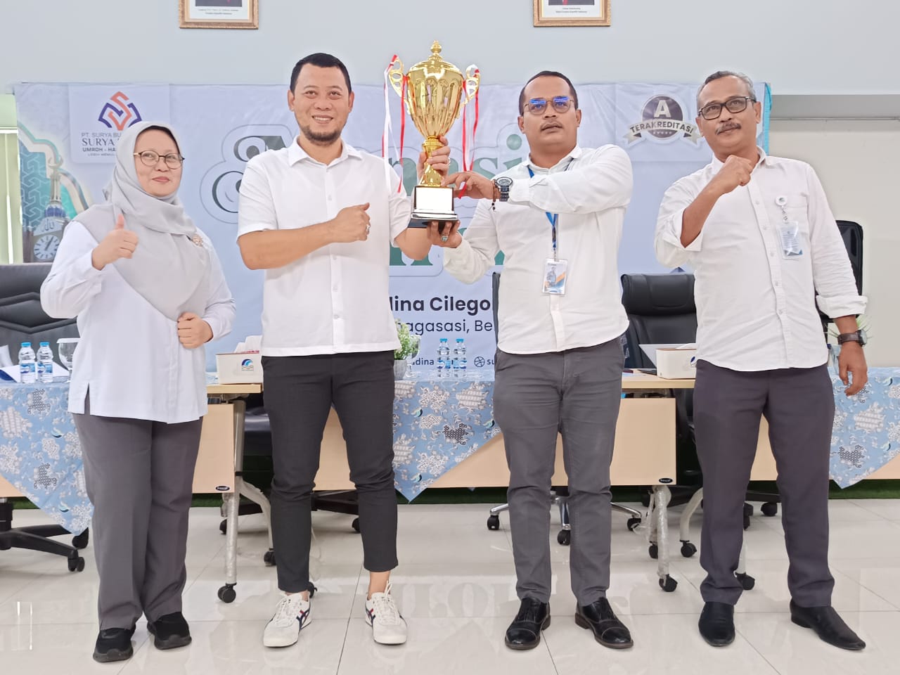 Ketua Bapor Perumda Tirta Bhagasasi Rahmat Sugimo, didampingi Dera Permana menerima trofi tersebut dan disambut tepuk tangan para kepala bagian, kepala cabang, dan kepala cabang pembantu yang hadir.