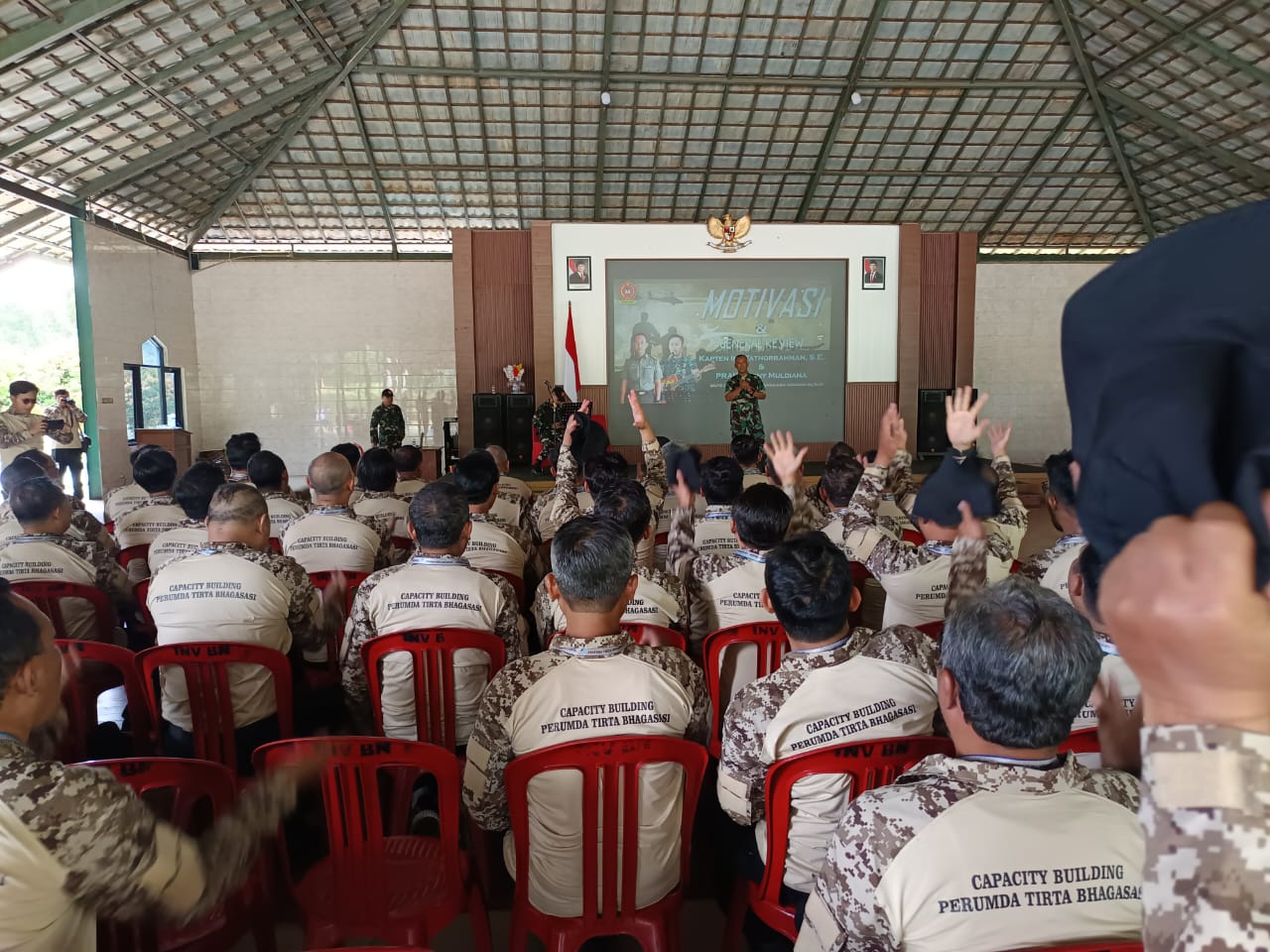 Kapten Inf Fathorrahman membuka sesi pertama terkait motivasi dan general review dalam kegiatan “capacity building” pemangku jabatan Perumda Tirta Bhagasasi Bekasi hari pertama.